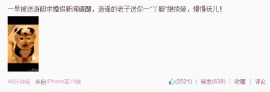 章子怡微博原文:一早被送游艇求婚假新闻砸醒,造谣的老子送你一“丫艇"继续装,慢慢玩儿!